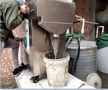9.設備運行過程中,漆渣自動刮走,并掉落在接渣桶中,清水逐漸變清回用到原來的清池中進行回用。大約用時1.5小時,水就能變清。企業可以根據自身的情況設定多長時間進行處理自己的污水,漆渣能減輕原來處理廢渣的95%,為處理漆渣大大節約成本,和水資源。